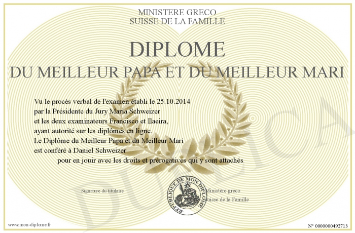 Envoyez par email votre Diplôme du Meilleur Papa et du Meilleur Mari personalisé