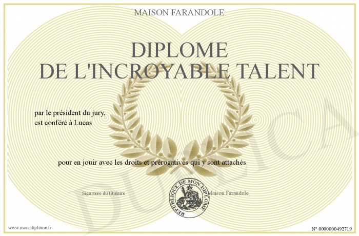 Envoyez par email votre Diplôme de l'incroyable talent personalisé