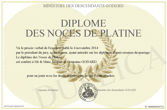 Envoyez par email votre Diplôme des Noces de Platine personalisé