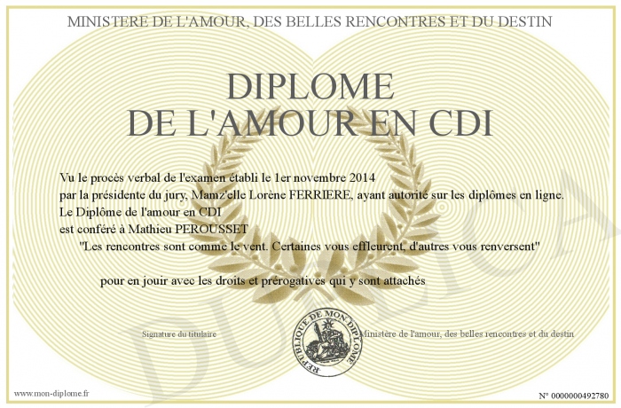 Envoyez par email votre Diplôme de l'amour en CDI personalisé