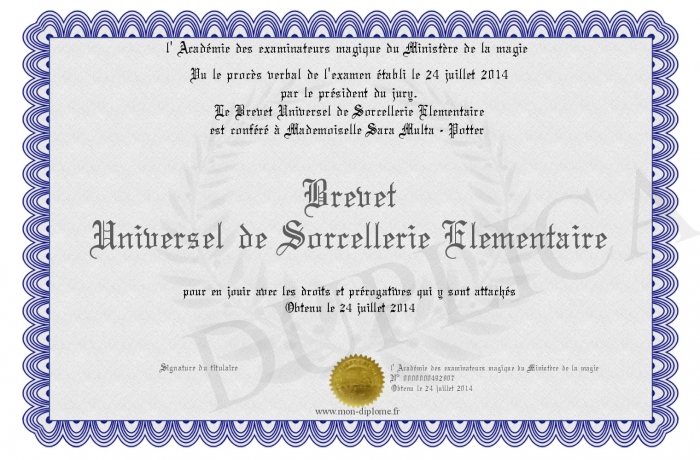 Envoyez par email votre Brevet Universel de Sorcellerie Elementaire personalisé