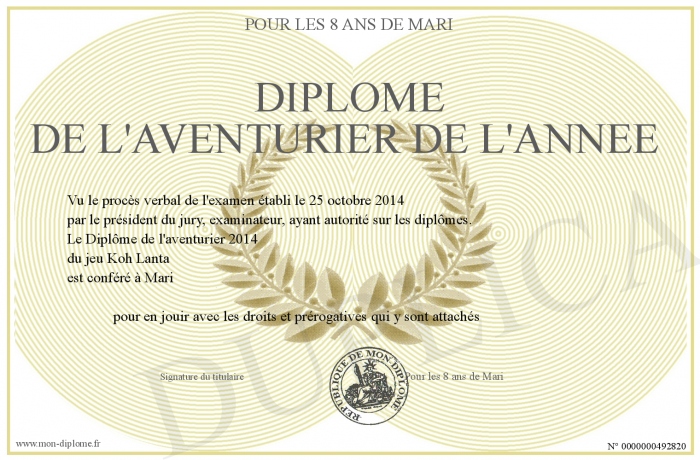 Envoyez par email votre Diplôme de l'aventurier de l'année personalisé
