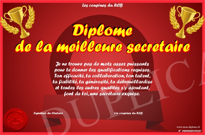 Envoyez par email votre Diplôme de la meilleure secretaire personalisé