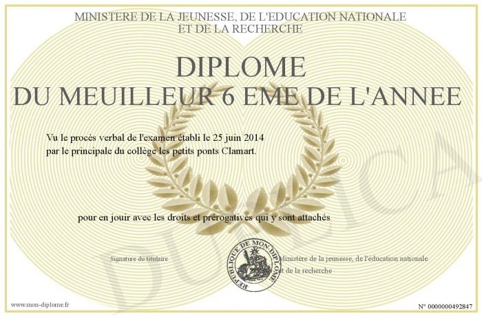 Envoyez par email votre Diplôme du meuilleur 6 eme de l'année personalisé
