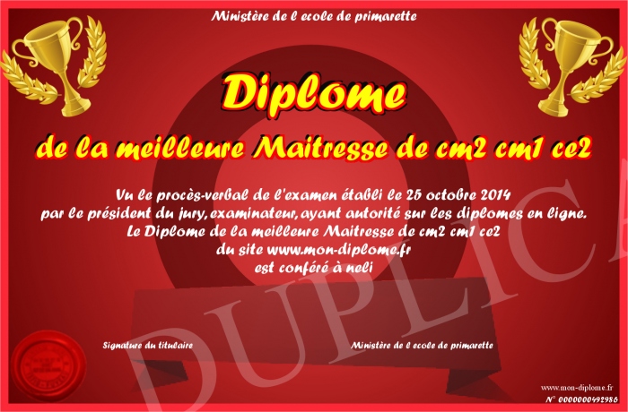 Envoyez par email votre Diplome de la meilleure Maitresse de cm2 cm1 ce2 personalisé