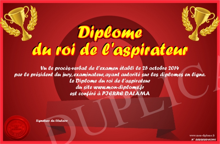 Envoyez par email votre Diplôme du roi de l'aspirateur personalisé