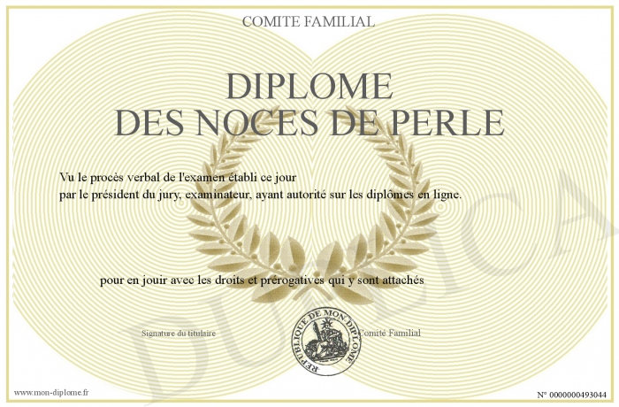 Envoyez par email votre Diplôme des Noces de Perle personalisé