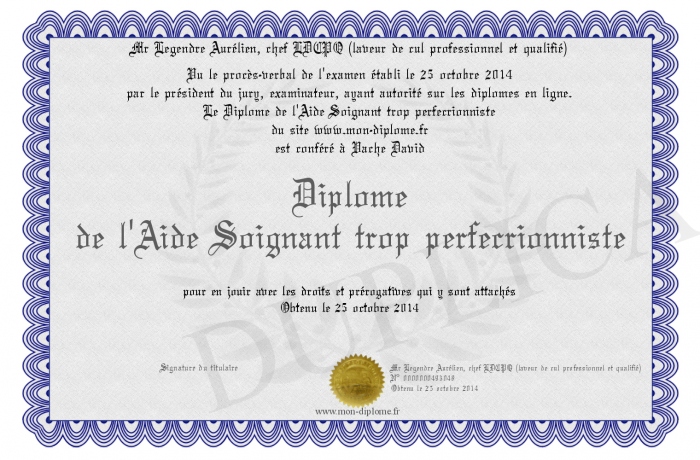 Envoyez par email votre Diplôme de l'Aide Soignant trop perfecrionniste personalisé