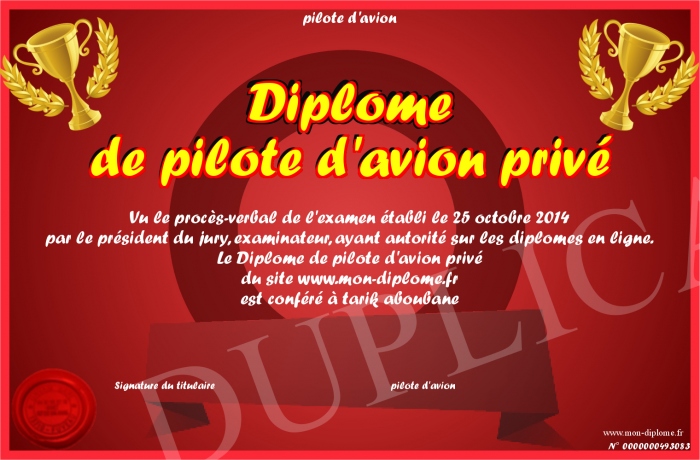Envoyez par email votre Diplôme de pilote d'avion privé personalisé