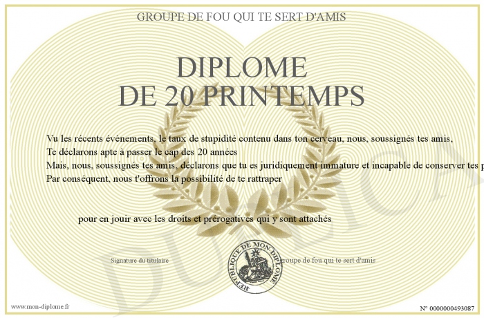 Envoyez par email votre Diplôme de 20 printemps personalisé