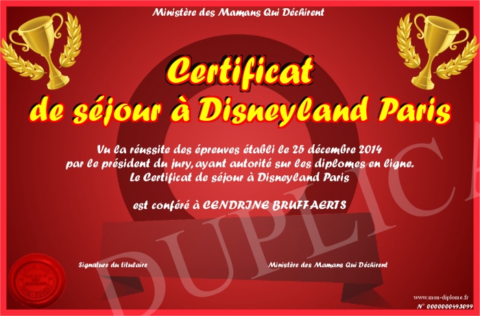 Envoyez par email votre Certificat de séjour à Disneyland Paris personalisé