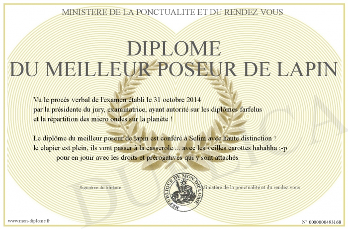 Envoyez par email votre Diplôme du meilleur poseur de lapin personalisé