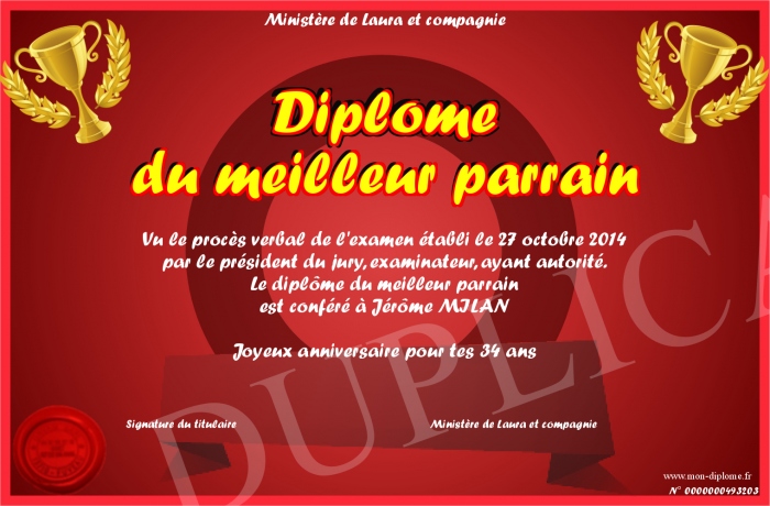 Envoyez par email votre Diplôme du meilleur parrain personalisé