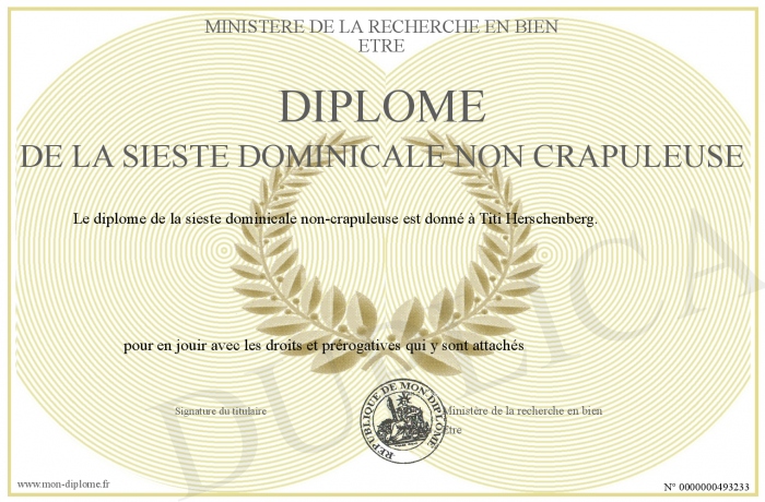 Envoyez par email votre Diplôme de la sieste dominicale non crapuleuse personalisé