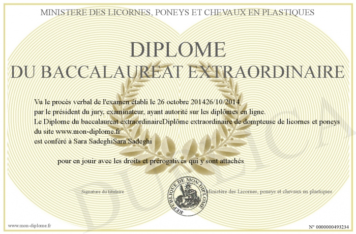 Envoyez par email votre Diplôme du baccalaureat extraordinaire personalisé
