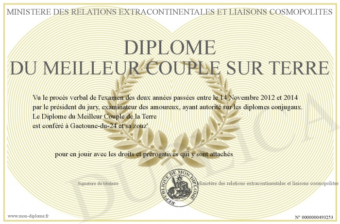 Envoyez par email votre Diplôme du meilleur couple sur terre personalisé