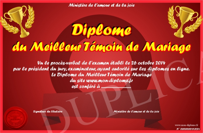 Envoyez par email votre Diplôme du Meilleur Témoin de Mariage personalisé