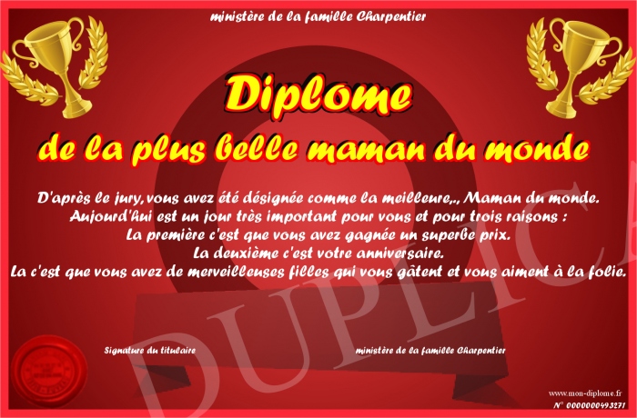 Envoyez par email votre Diplôme de la plus belle maman du monde personalisé