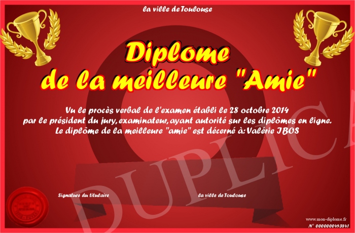 Envoyez par email votre Diplome de la meilleure -Amie- personalisé