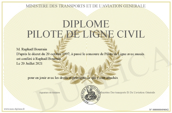 Envoyez par email votre Diplôme Pilote De Ligne Civil personalisé