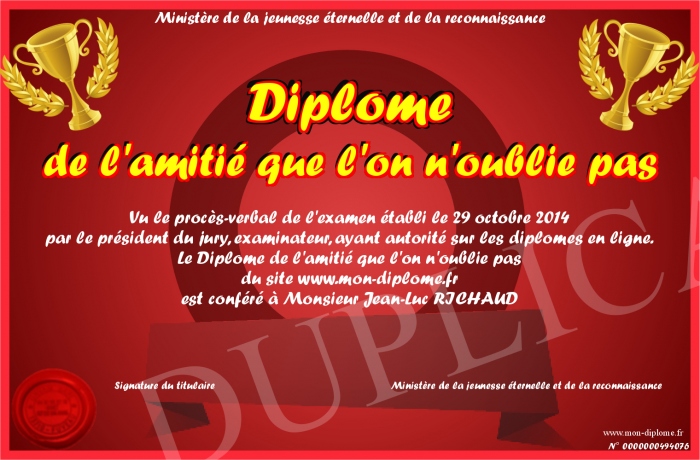 Envoyez par email votre Diplôme de l'amitié que l'on n'oublie pas personalisé