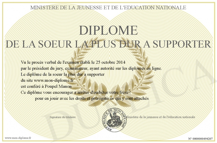 Envoyez par email votre Diplôme de la soeur la plus dur a supporter personalisé