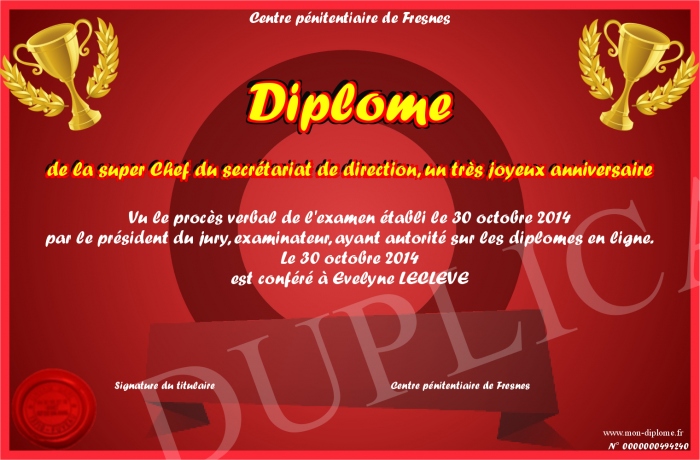 Envoyez par email votre Diplôme de la super Chef du secrétariat de direction, un très joyeux anniversaire personalisé