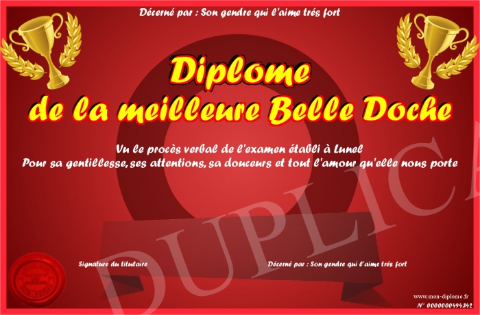 Envoyez par email votre Diplôme de la meilleure Belle Doche personalisé