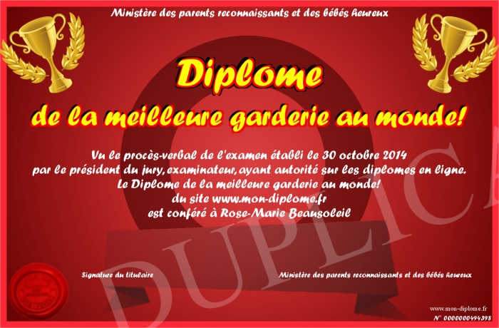 Envoyez par email votre Diplôme de la meilleure garderie au monde! personalisé