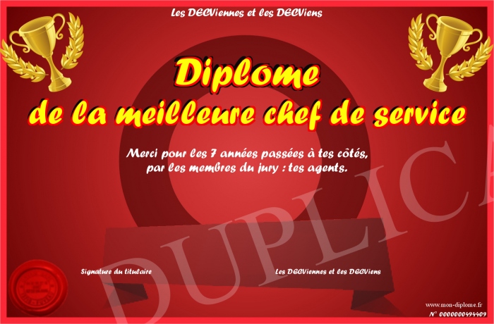 Envoyez par email votre Diplôme de la meilleure chef de service personalisé