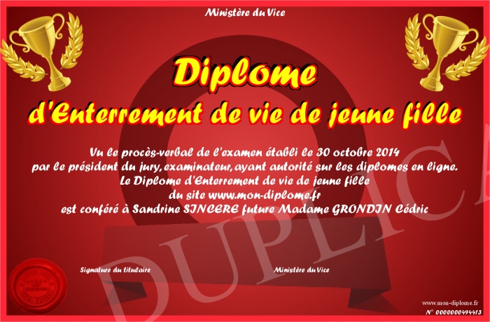 Envoyez par email votre Diplome d'Enterrement de vie de jeune fille personalisé