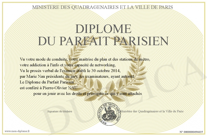 Envoyez par email votre Diplôme du Parfait Parisien personalisé