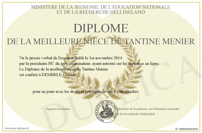 Envoyez par email votre Diplôme de la meilleure nièce de Tantine Menier personalisé