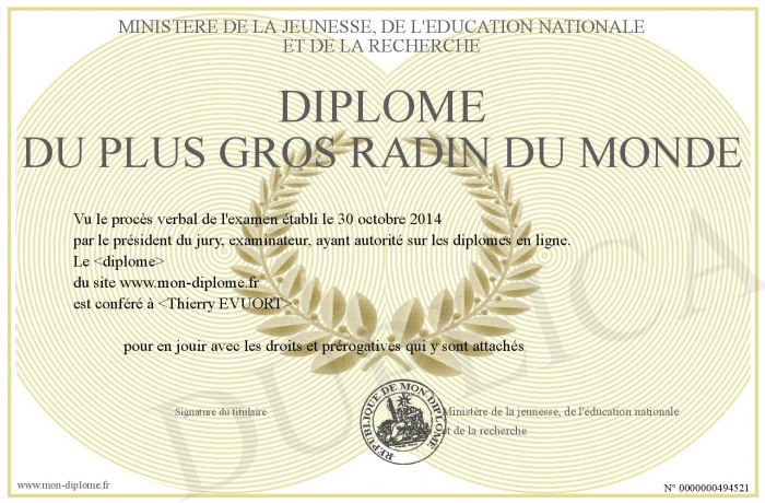 Envoyez par email votre Diplôme du PLUS GROS RADIN DU MONDE personalisé