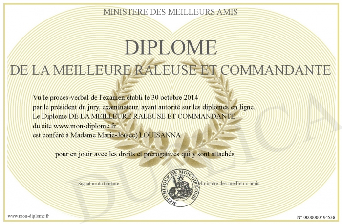 Envoyez par email votre Diplôme DE LA MEILLEURE RALEUSE ET COMMANDANTE personalisé