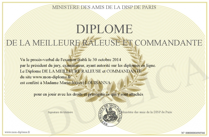 Envoyez par email votre Diplôme DE LA MEILLEURE RALEUSE et COMMANDANTE personalisé