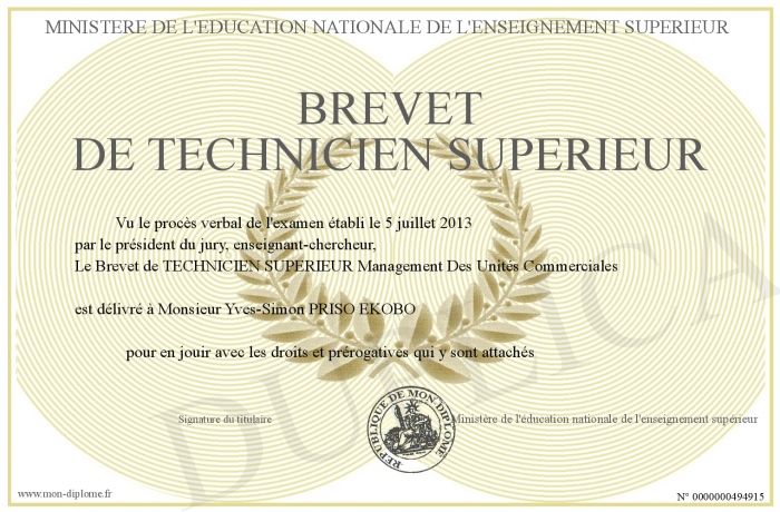 Envoyez par email votre Brevet de TECHNICIEN SUPERIEUR personalisé
