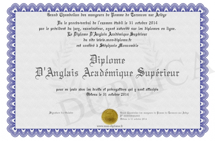 Envoyez par email votre Diplôme D'Anglais Académique Supérieur personalisé