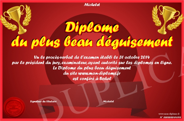 Envoyez par email votre Diplôme du plus beau déguisement personalisé