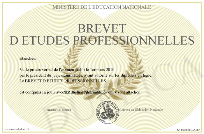 Envoyez par email votre BREVET D ETUDES PROFESSIONNELLES personalisé