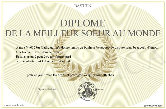 Envoyez par email votre Diplôme de la meilleur soeur au monde personalisé