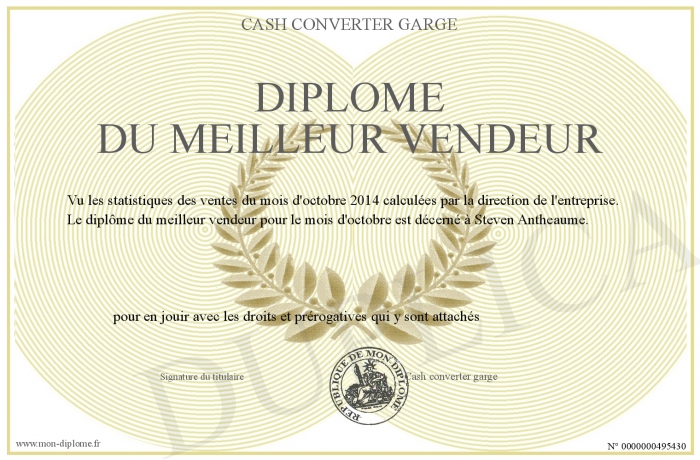 Envoyez par email votre Diplôme du meilleur vendeur personalisé