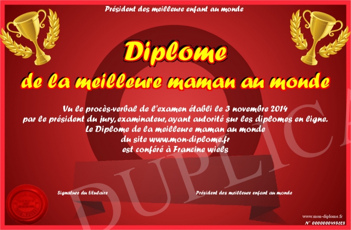 Envoyez par email votre Diplôme de la meilleure maman au monde personalisé