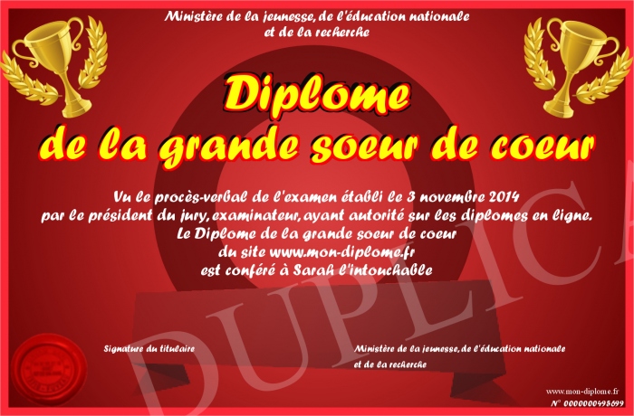 Envoyez par email votre Diplôme de la grande soeur de coeur personalisé
