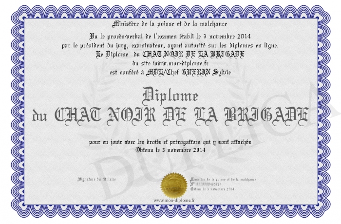 Envoyez par email votre Diplôme du CHAT NOIR DE LA BRIGADE personalisé