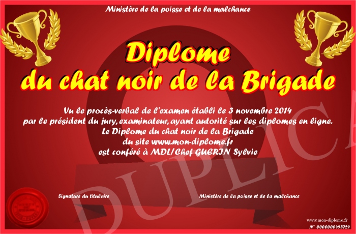 Envoyez par email votre Diplôme du chat noir de la Brigade personalisé