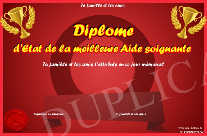 Envoyez par email votre Diplôme d'Etat de la meilleure Aide soignante personalisé