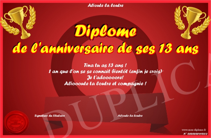 Envoyez par email votre Diplôme de l'anniversaire de ses 13 ans personalisé