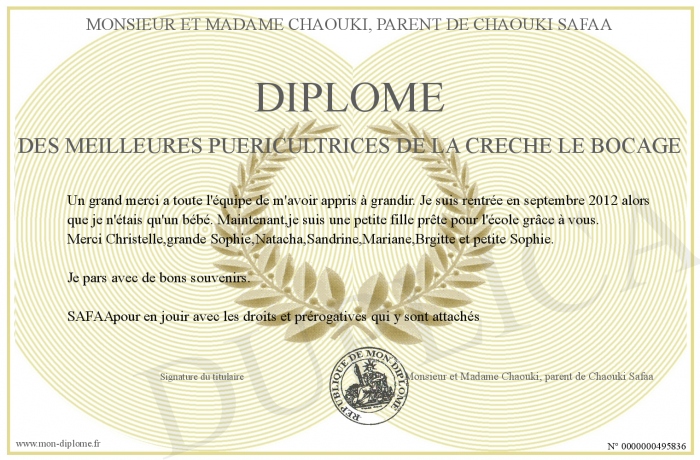 Envoyez par email votre Diplôme des meilleures puericultrices de la creche le Bocage personalisé
