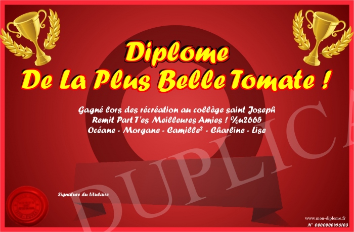Envoyez par email votre Diplôme De La Plus Belle Tomate ! personalisé